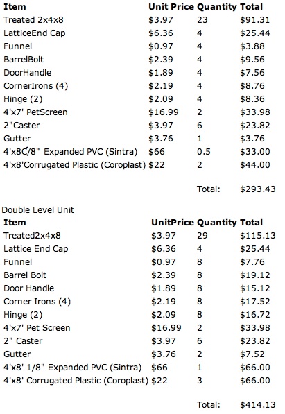 Approximate Costs (not including screws, hot glue sticks, staples, tools or tax)