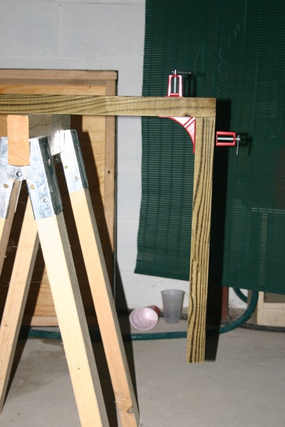 Use of 90 degree vice clamps when building the top and bottom frame pieces. The frame outer perimeter is made of two 8' 2x4s and two 21” 2x4s.