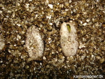 Ever since I first started to work with chameleons, I had my eyes on Ch. cristatus, but I never managed to get my hands on a pair. In 2005 I bought my first WC pair and had big breeding plans, as they both looked to be in good health. I kept them as a pair, but the female was really aggressive toward the male, even though the terrarium was large and well planted. The female had a fat belly but there was no other signs indicating that she was gravid, no dark coloration like the one you see on F. pardalis. Never the less, after 2 weeks she laid 13 eggs. A small clutch, compared to the F. pardalis as I normally work with. Ch. cristatus can lay between 12-21 eggs, but I suspect the smaller sized clutch of my female was due to the fact that she was rather old and a result of the stress from being imported.
