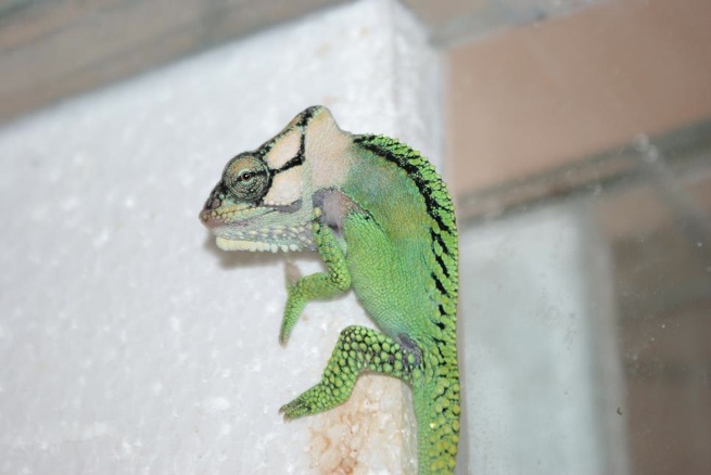 Male Bradypodion damaranum on white Styrofoam siding of one of Decker’s terrariums. Photo by Steven Deckers.