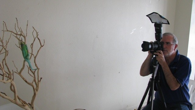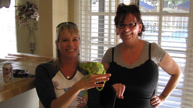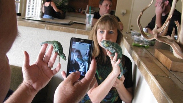 Picture taking is always enjoyed. Here Rodney balances camera and color-up inspiration while Ginger Scott patiently poses. Chameleon people have had to learn patience!
